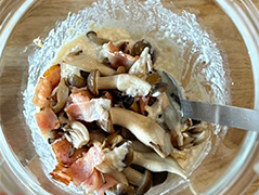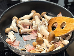 - 2.しめじ、ベーコンをフライパンで焼いておく。