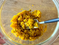 柔らかくなったら、レンジから取り出してフォークで潰す。