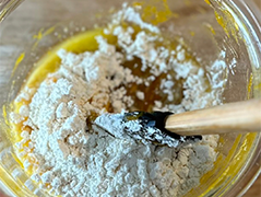- 3.砂糖、牛乳、溶き卵、溶かしたバターを順番に加え、その都度混ぜる。最後にホットケーキミックスを加えて混ぜる。
