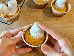 - 4.型に生地を入れ、170℃に予熱したオーブンで15〜20分焼く。焼き上がったらすぐにマシュマロを立ててのせる。マシュマロが溶けてくるので、指で押さえながら接着面をおばけの形になるように広げる。
